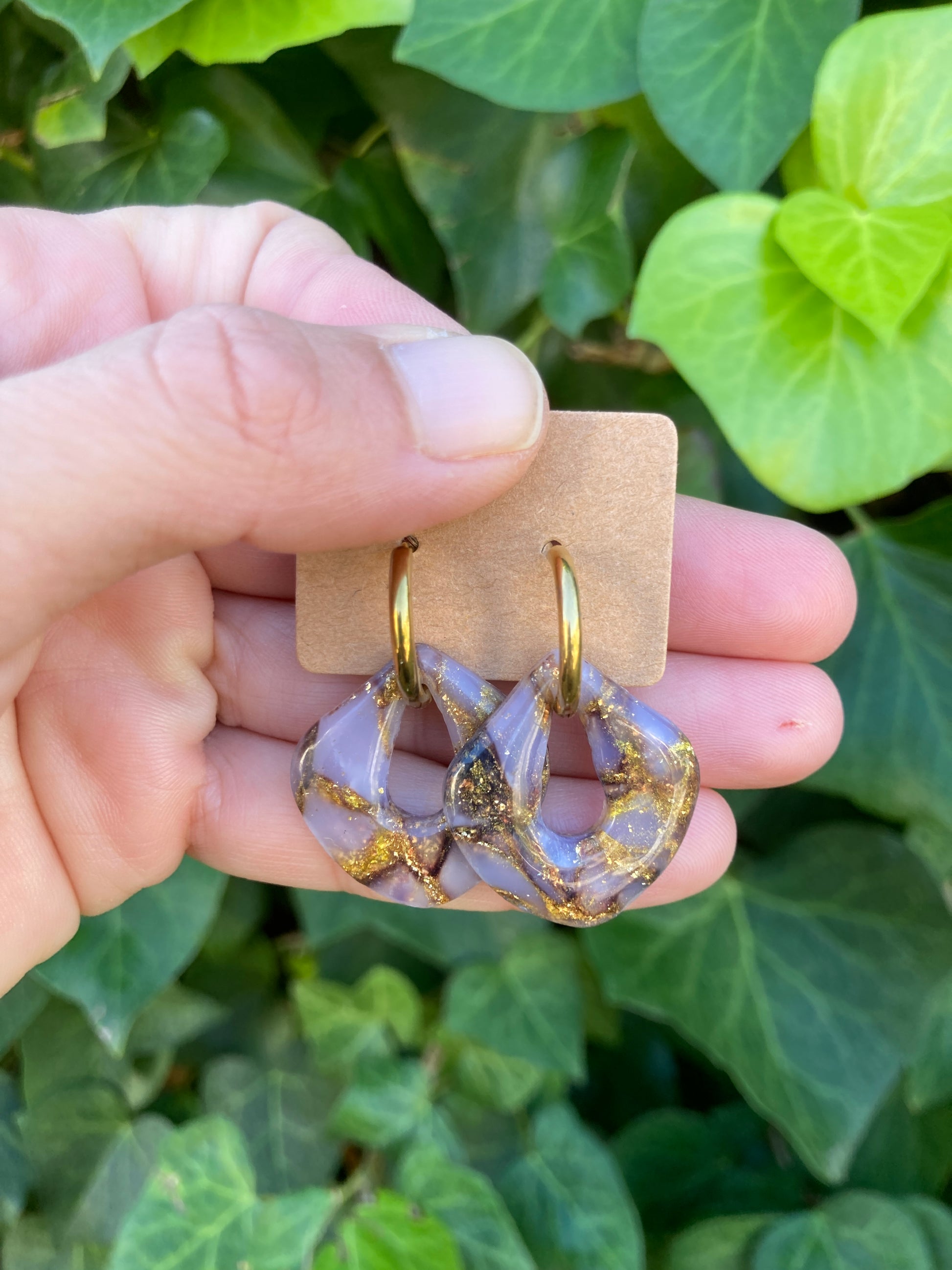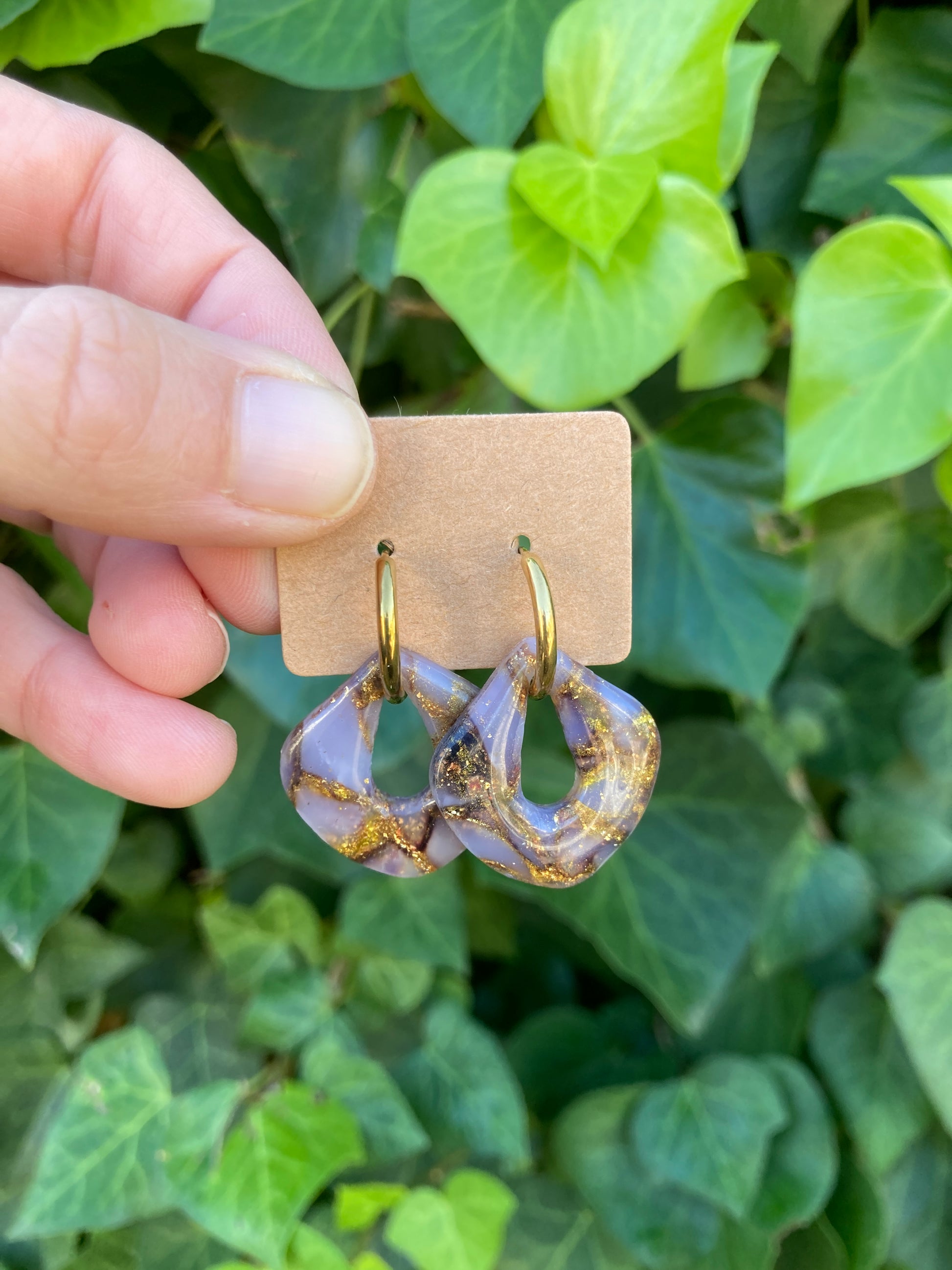 Rombo redondeado hueco colgado de un aro de acero inoxidable 304L dorado. Estampado translúcido con marrón y dorado con efecto piedra preciosa.