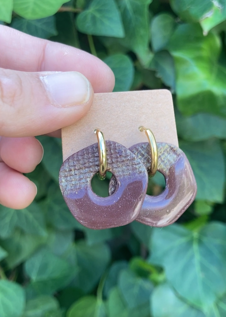 Piezas redondas orgánicas huecas de color marrón oscuro, con mitad de la pieza texturizada con dorado y la otra mitad lisa. Acabado brillante.