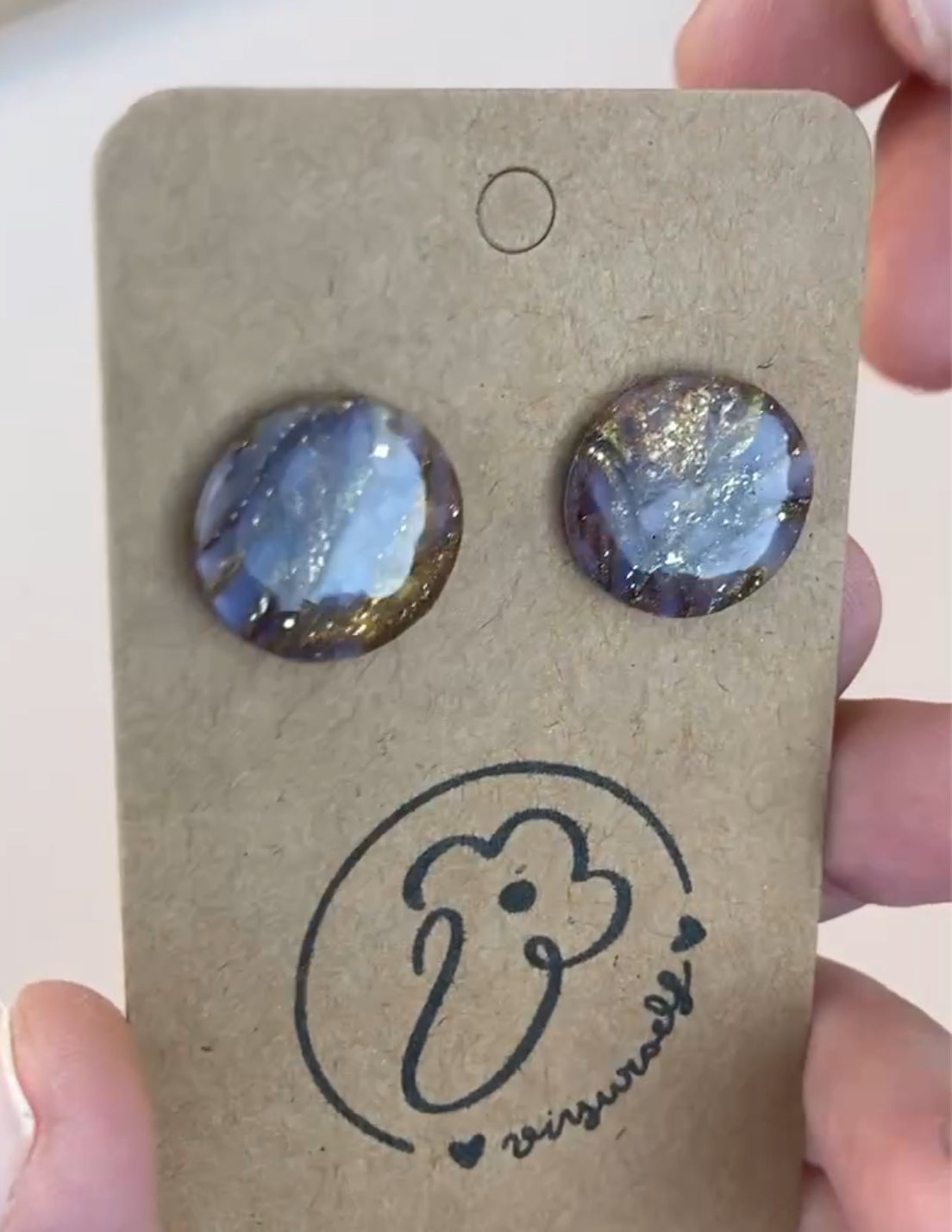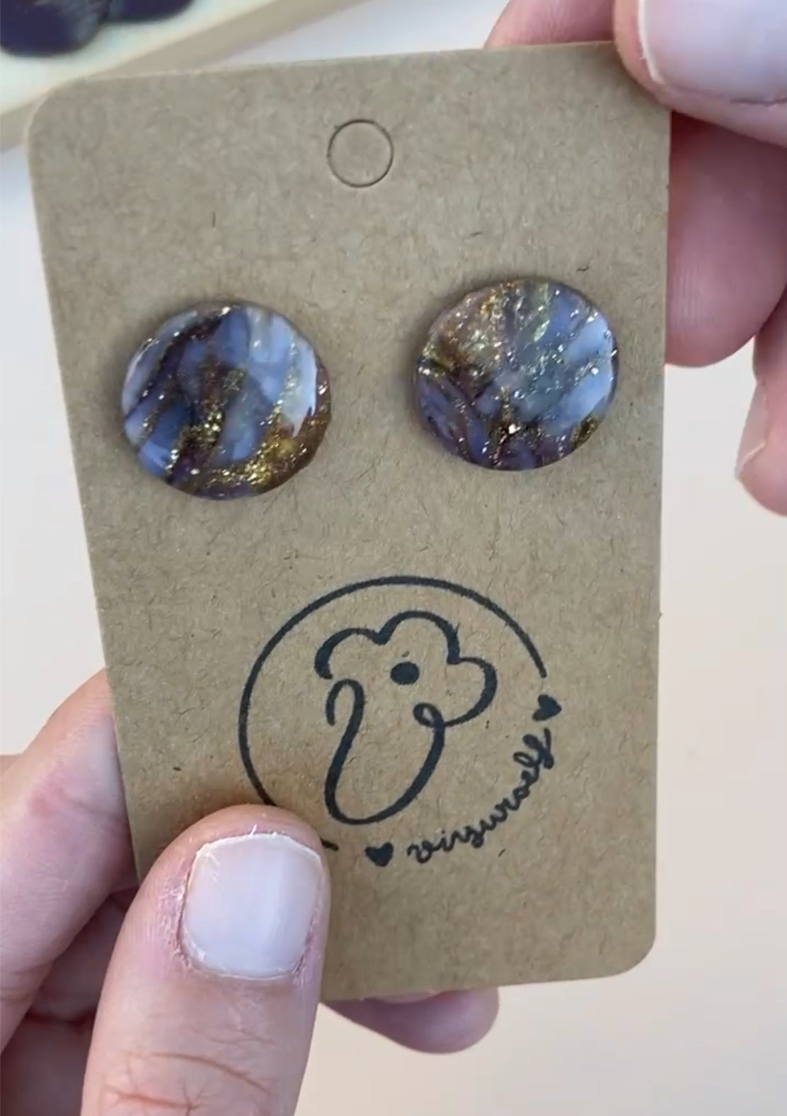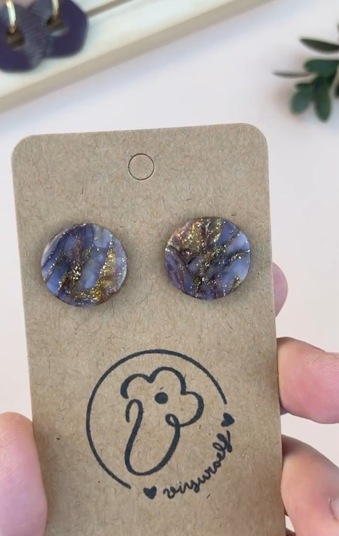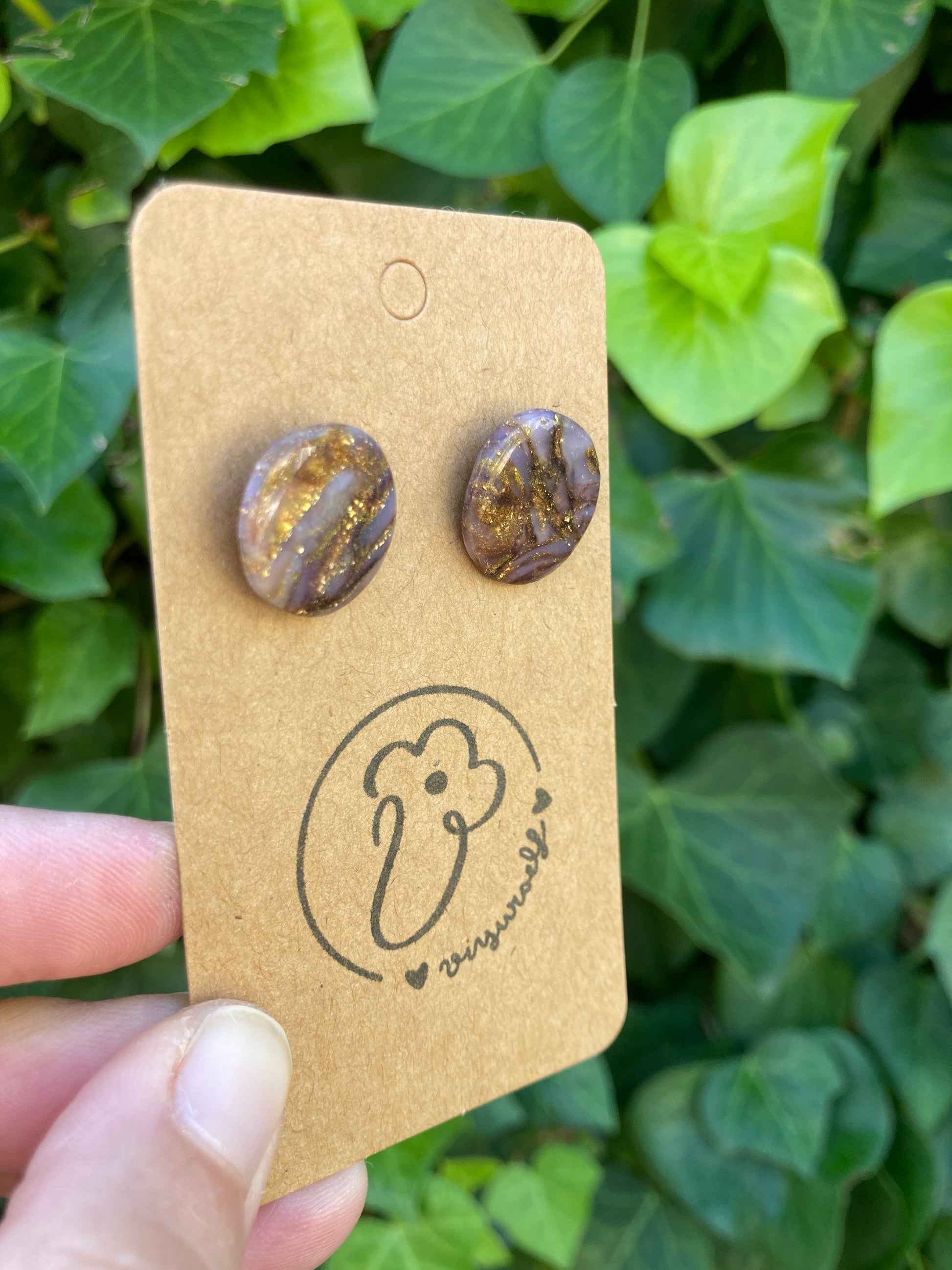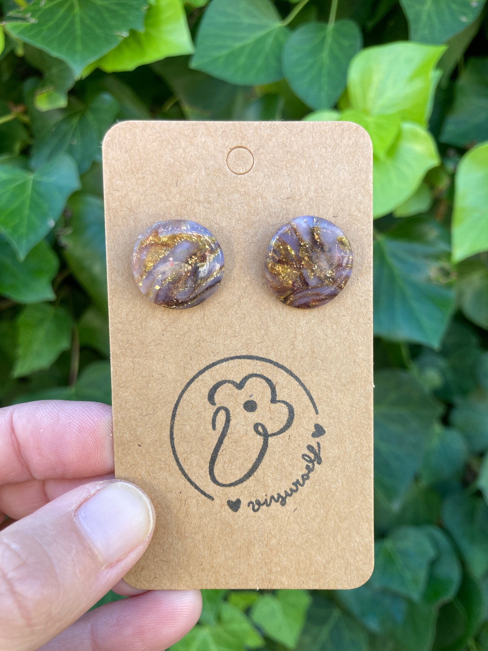 Piezas redondas efecto cuarzo marrón con partes translúcidas y toques brillantes de dorado y cobre. Acabado brillante.
