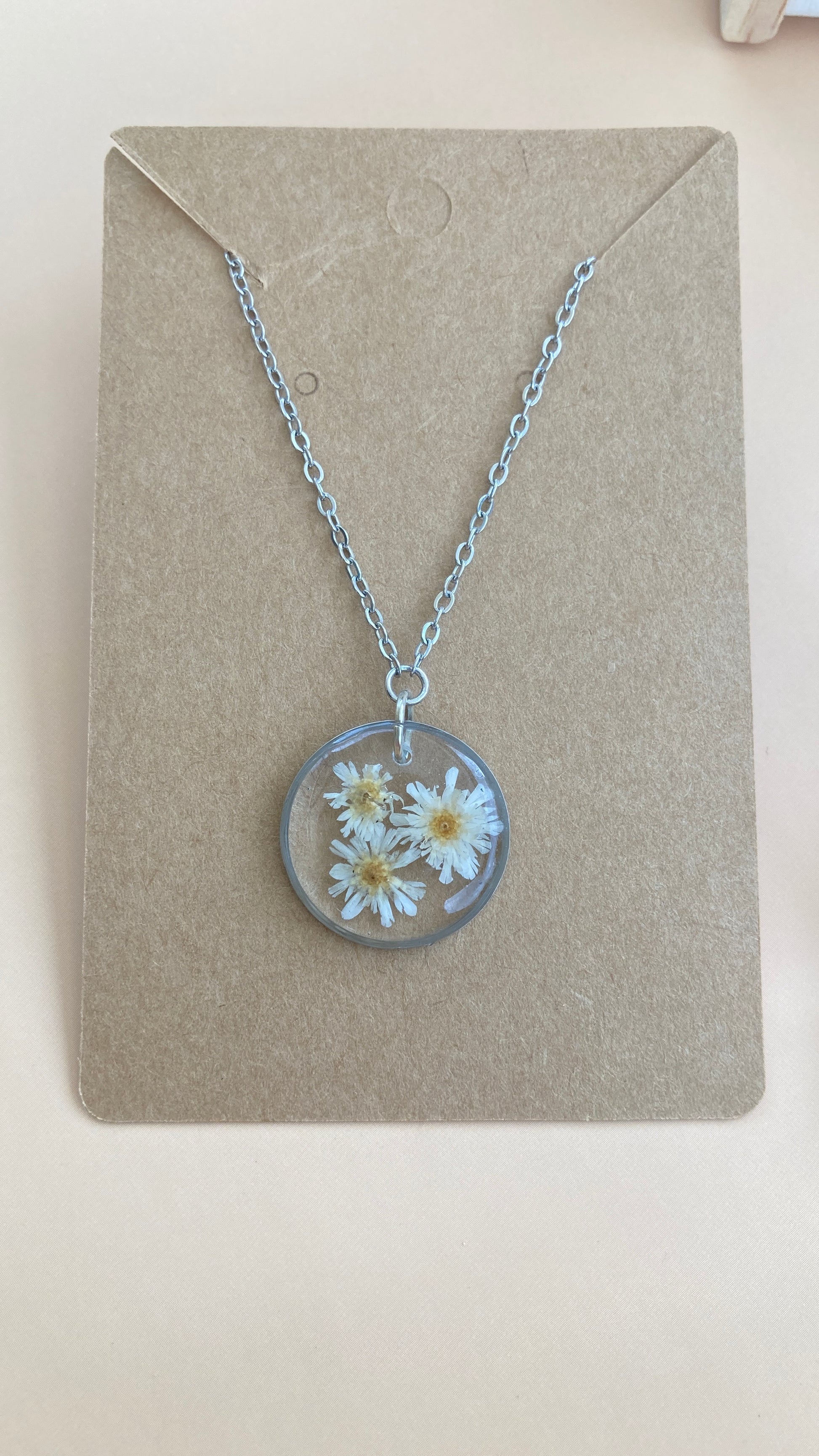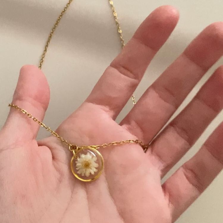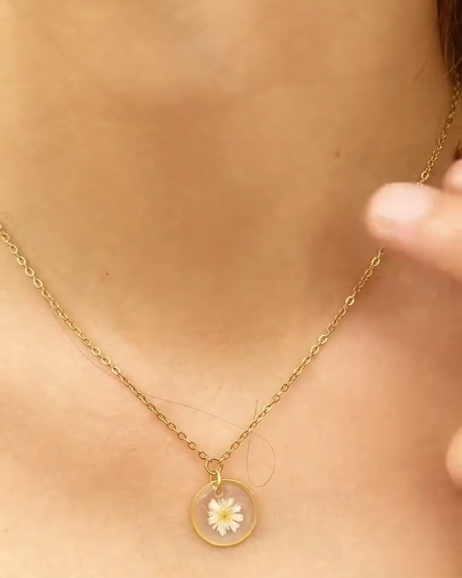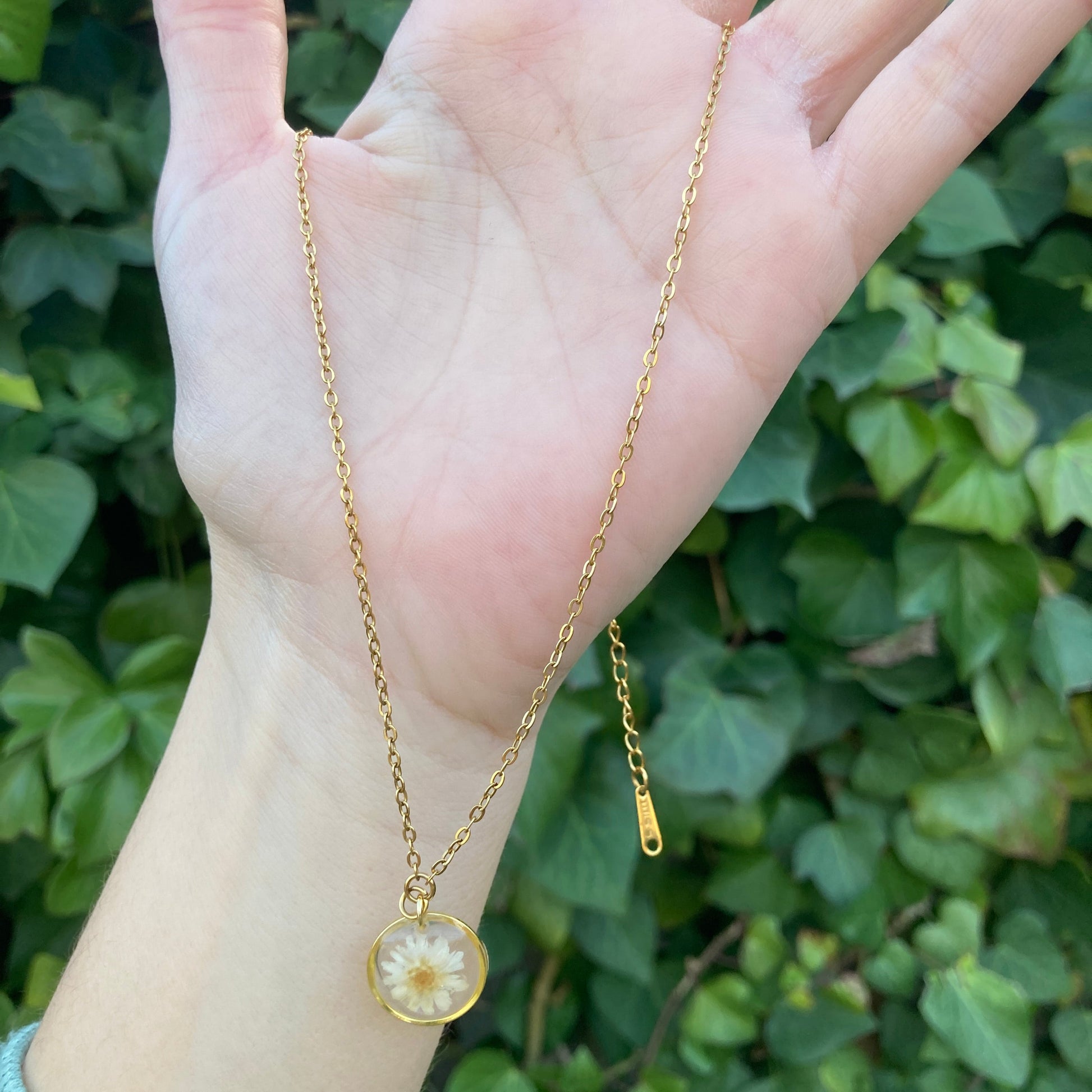 Collar único, hecho a mano con flores secas encapsuladas en resina, para que la belleza de la naturaleza te acompañe siempre.