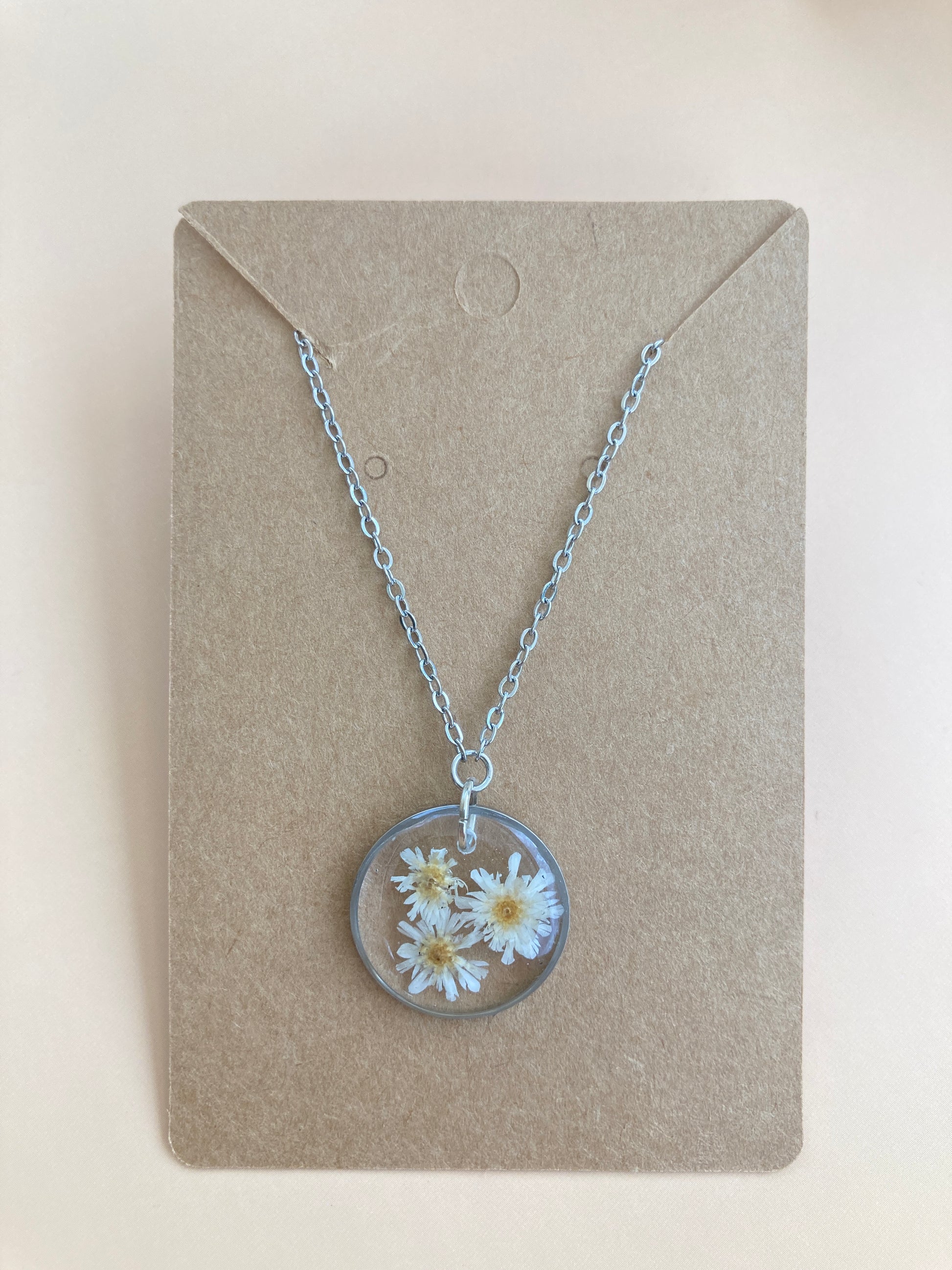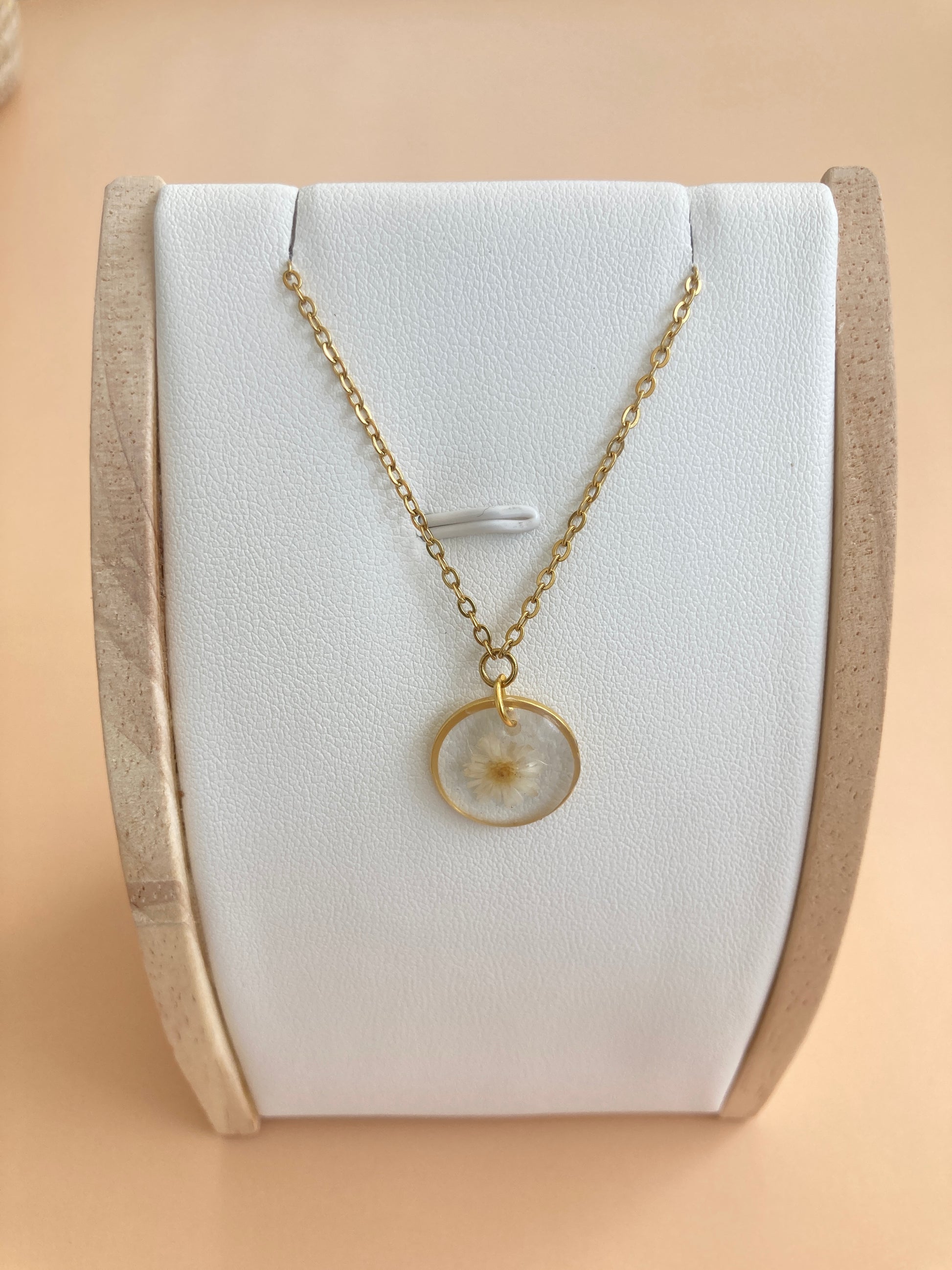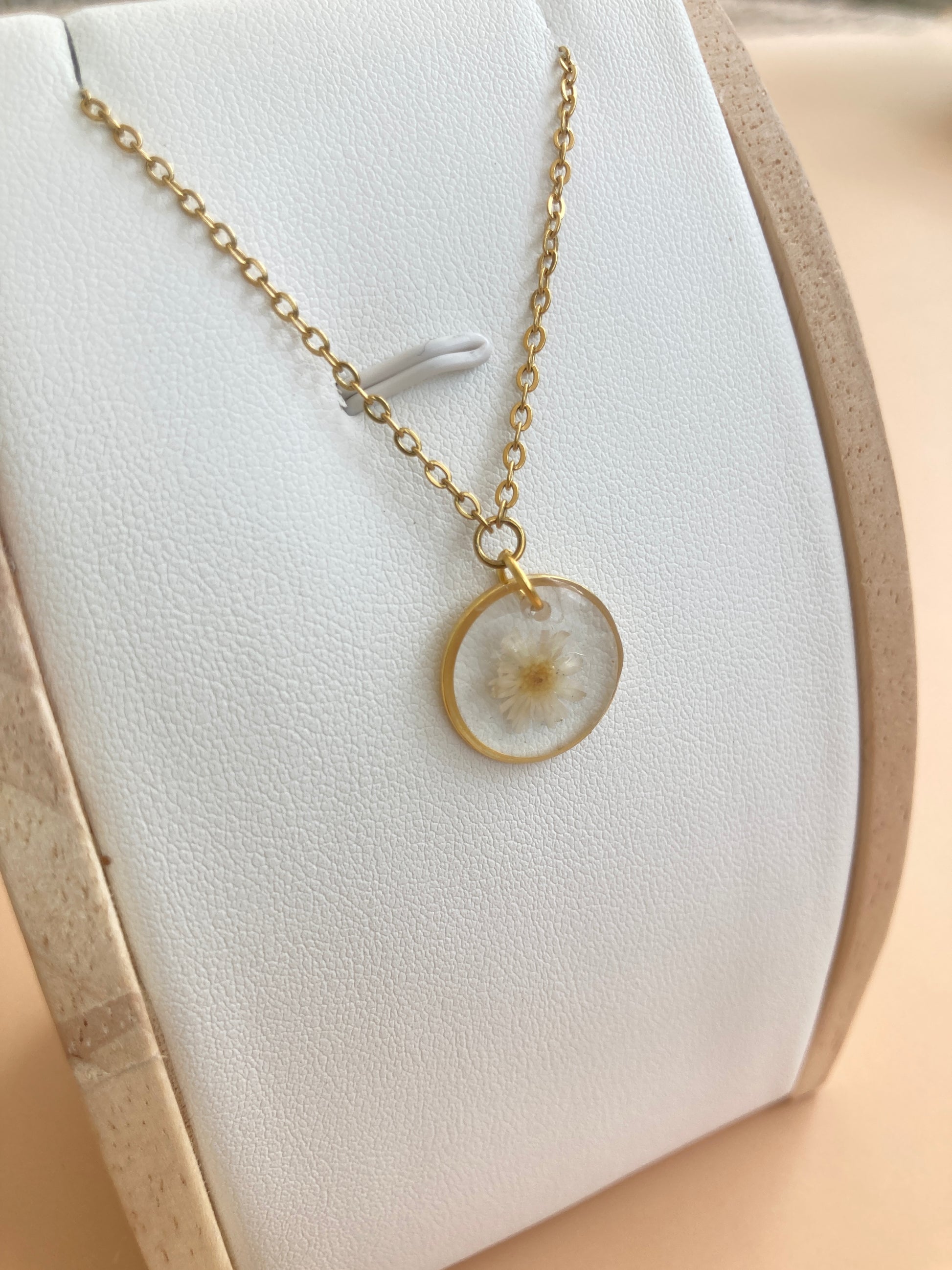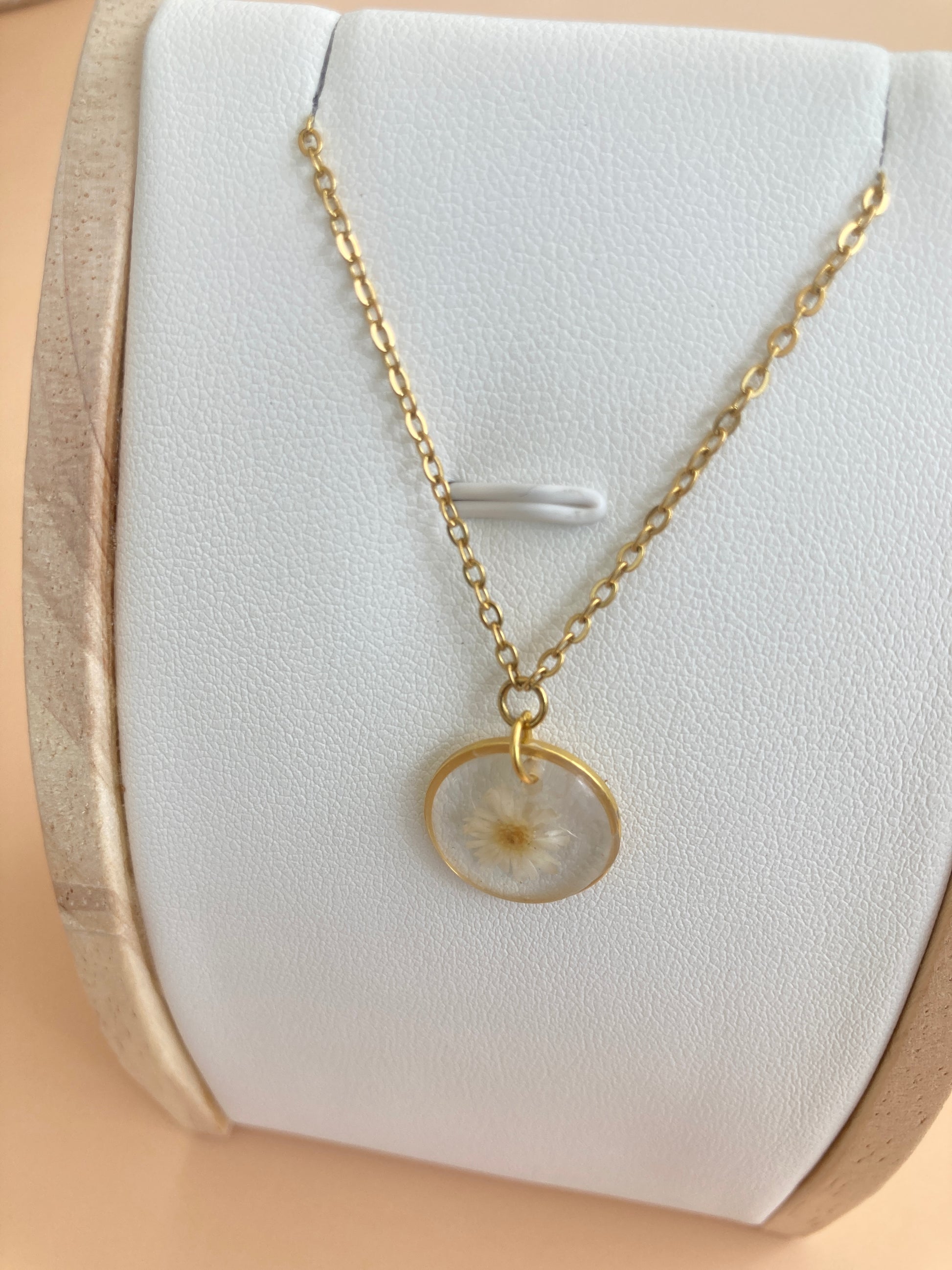 Collar único, hecho a mano con flores secas encapsuladas en resina, para que la belleza de la naturaleza te acompañe siempre.
