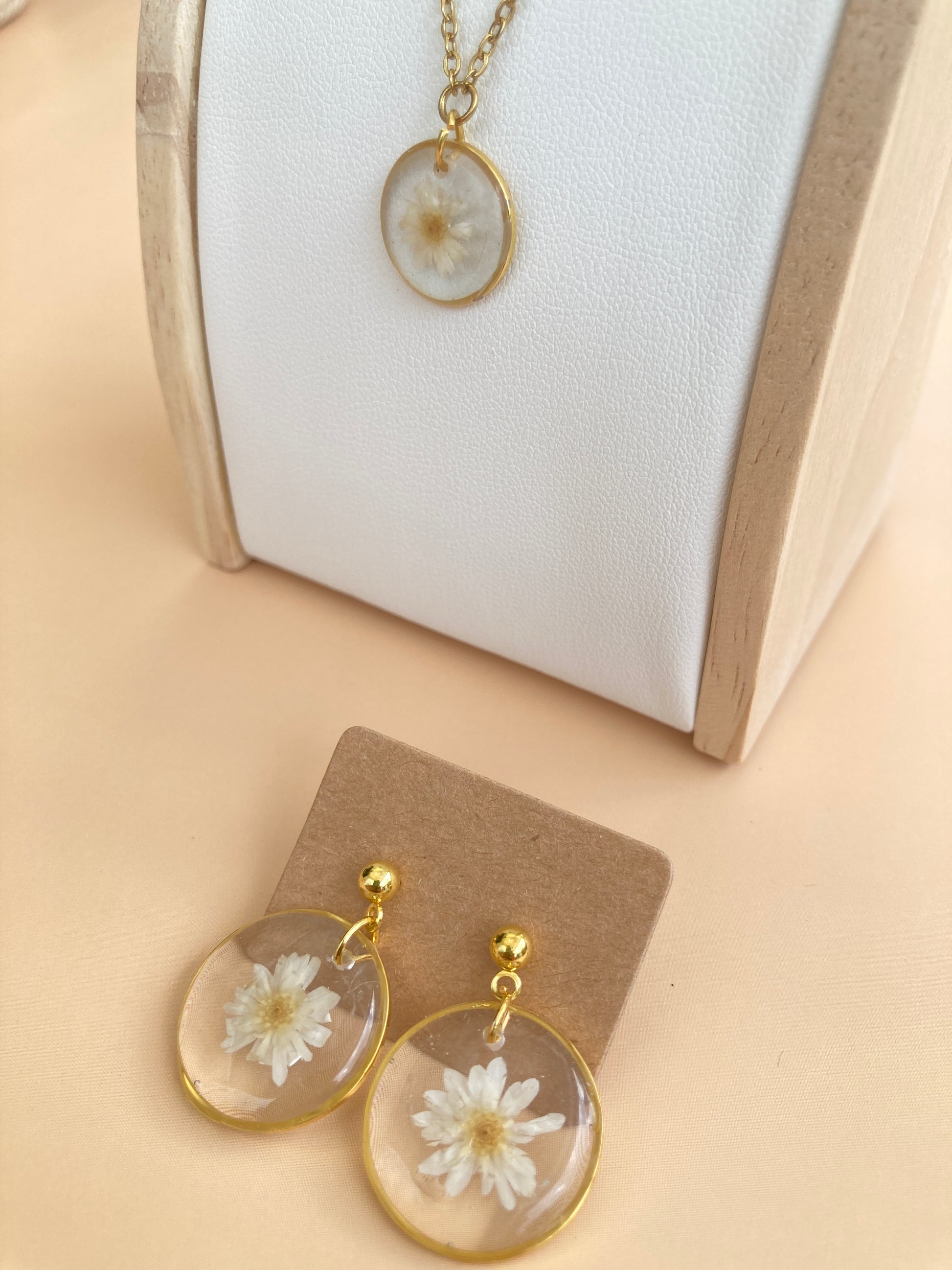 Collar y pendientes únicos, hechos a mano con flores secas encapsuladas en resina, para que la belleza de la naturaleza te acompañe siempre.