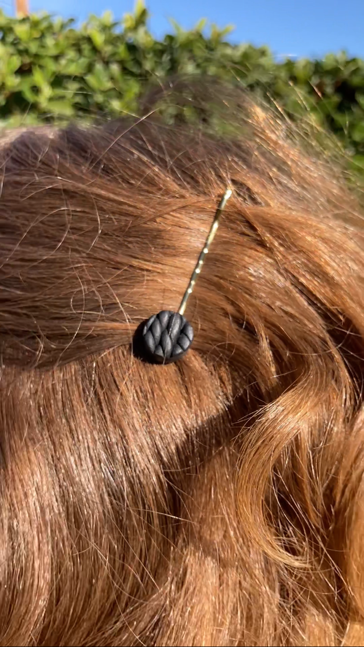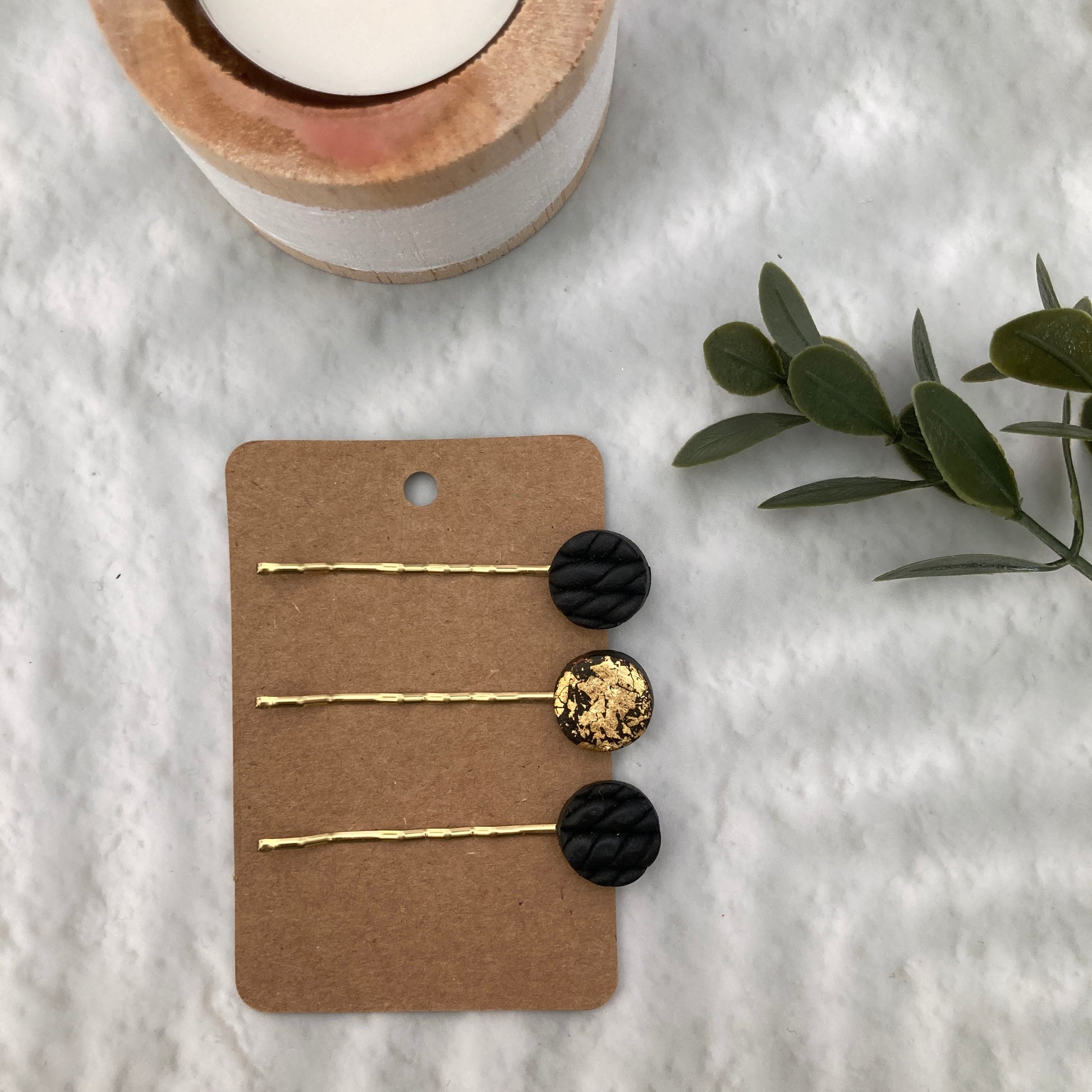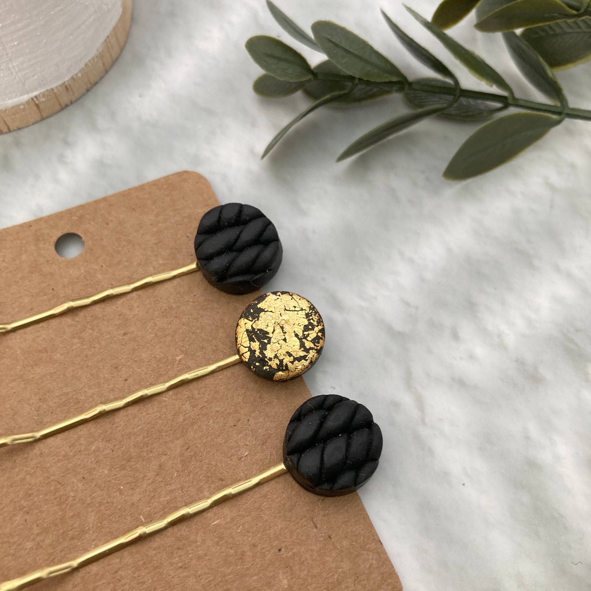 Pack de tres horquillas doradas con piezas decorativas negras, dos de ellas trenzadas y la otra también negra pero con toques dorados.