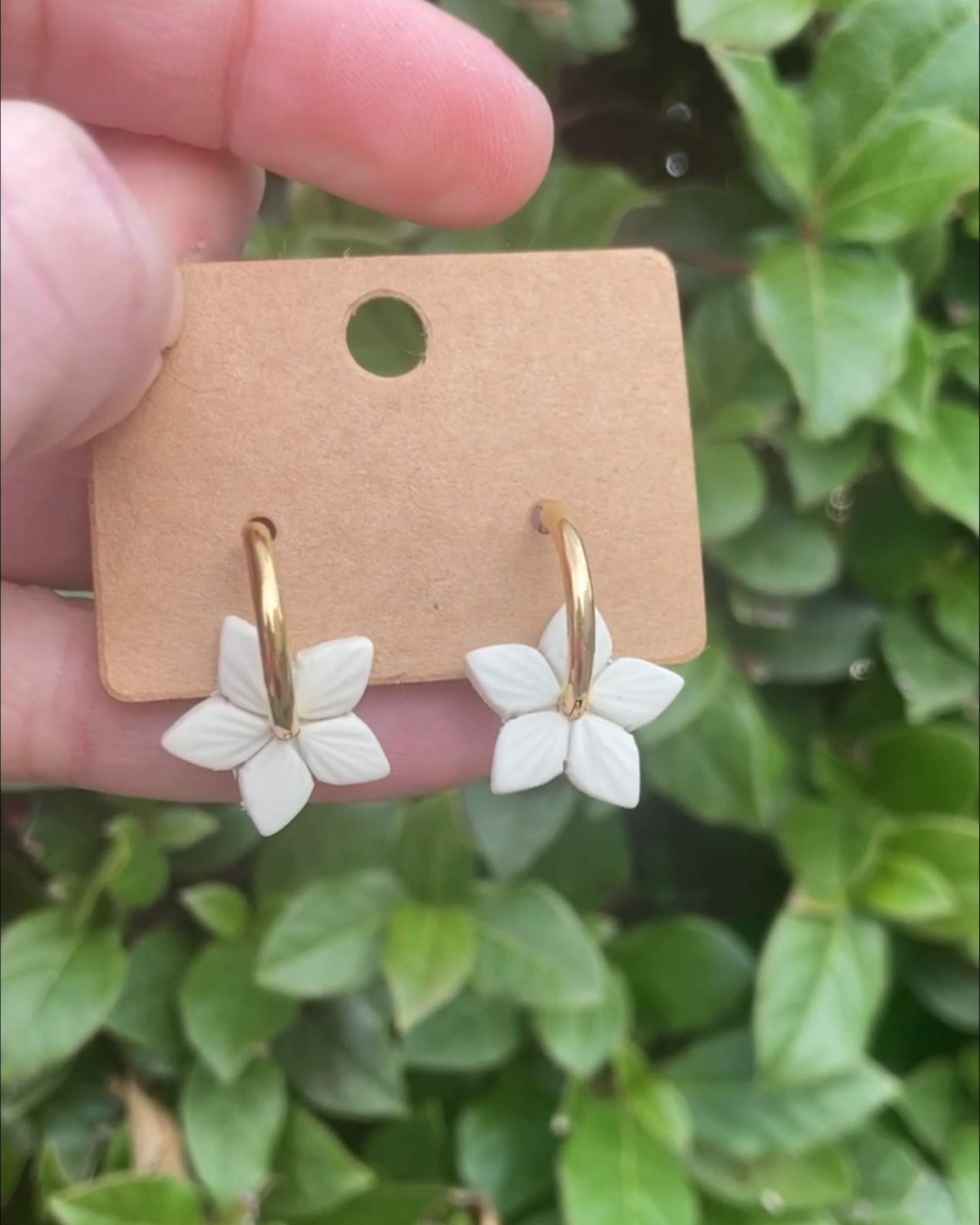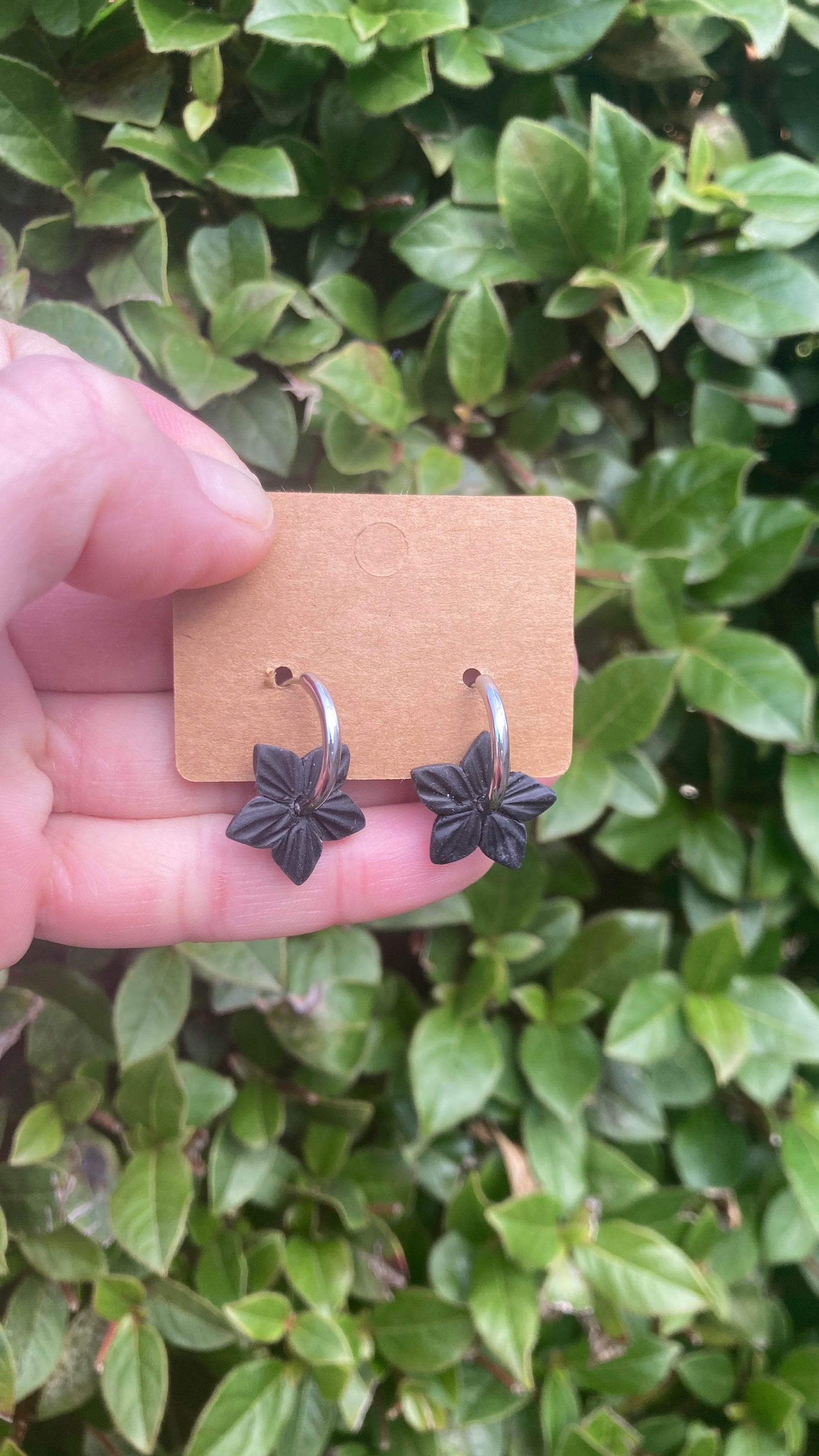 Pendientes de aro con flor de 5 pétalos texturizados a mano en arcilla polimérica.